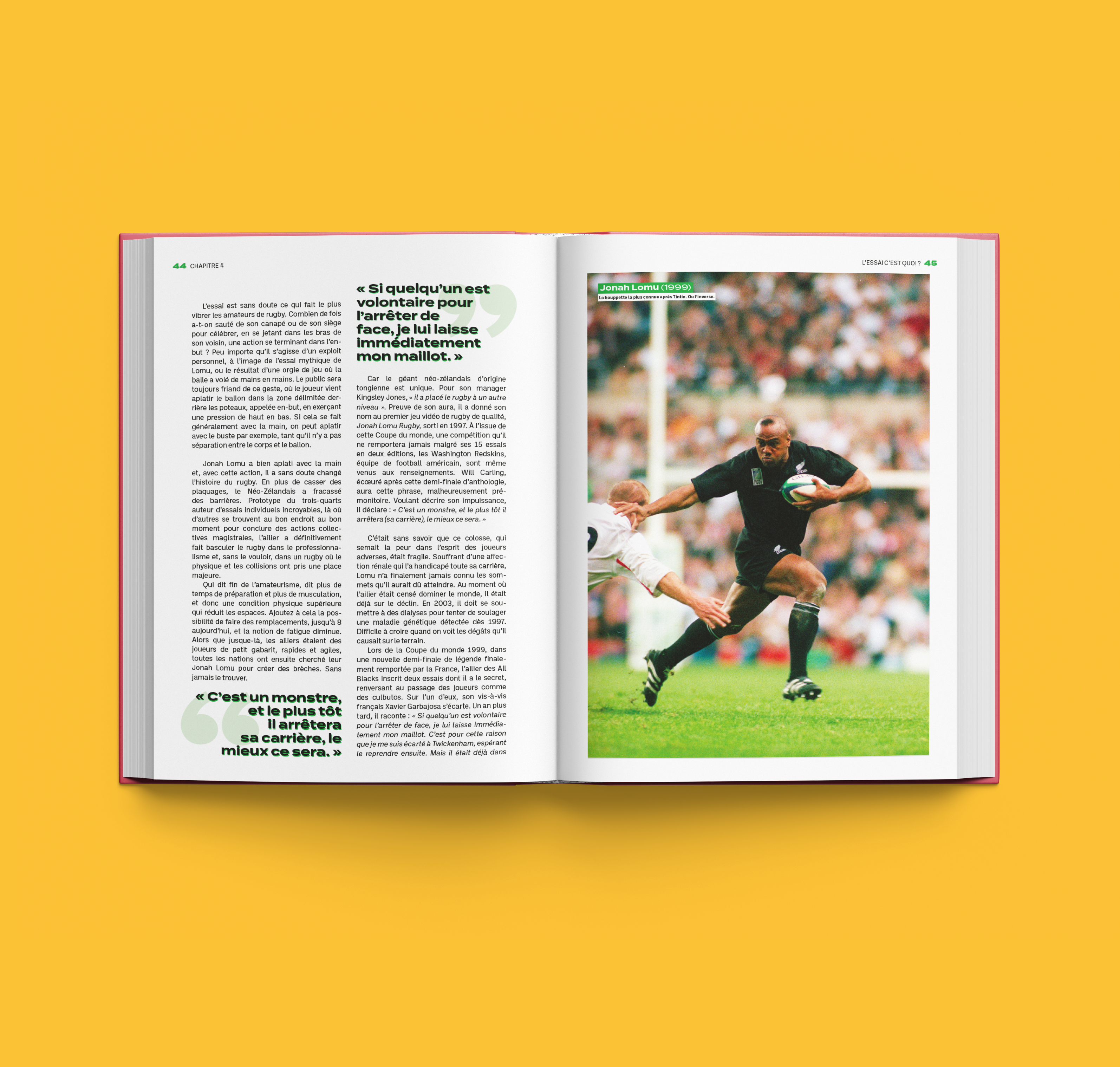 Du « crochet » au « caramel » en passant par le franchissement et le jeu au pied, une épopée captivante, d'un hémisphère à l’autre, qui saura séduire les fans de Jonah Lomu comme ceux d’Antoine Dupont.